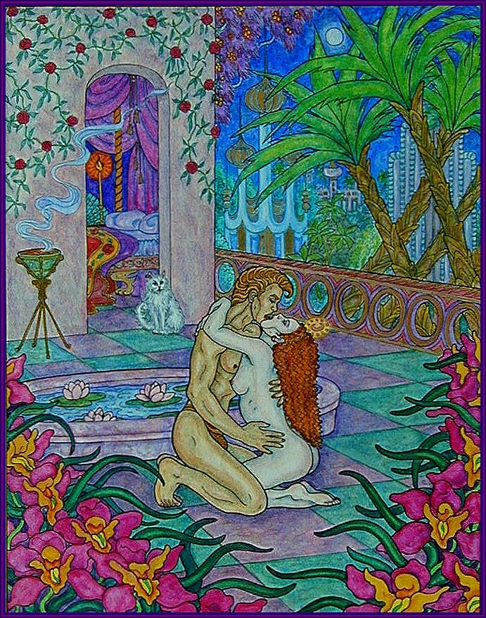 Over the years, I’ve done much sensuous and erotic art in various mediums, such as pencil, pen and ink, and watercolor. I love the decorative fantasy environments celebrated in these watercolors paintings. The colors are vivid and the designs strongly influenced by Art Nouveau and Art Deco.