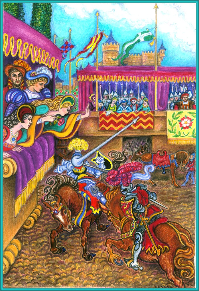 The Sun and Stars: This is the cover illustration for Elizabeth Adair’s Tudor mystery. It’s very much a redo of Arthur Rackam’s more medieval version, in the public domain. The composition, with both the watchers and the tournament featured so prominently was perfect for her opening scene.